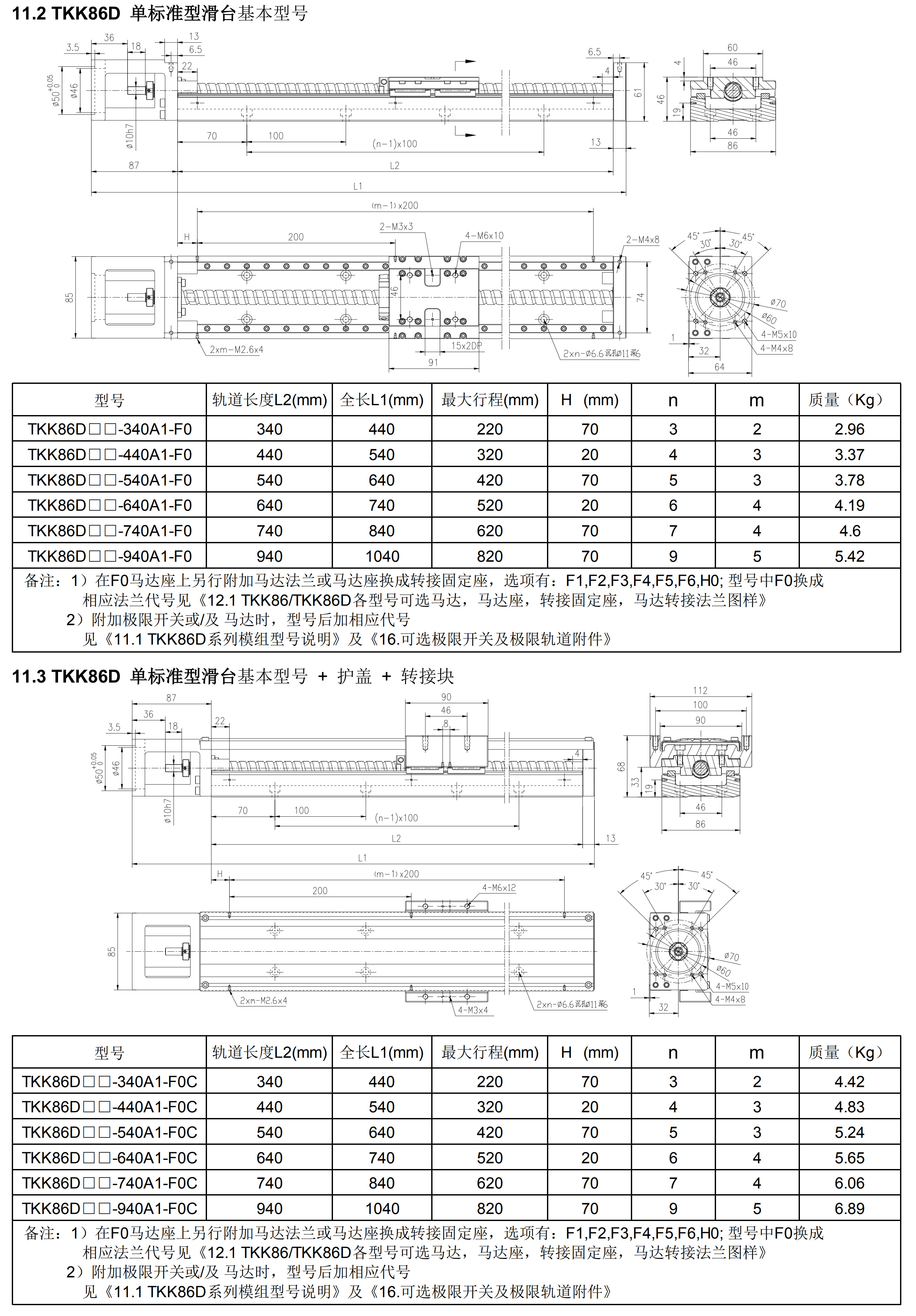 TKK系列線性模組為鋁制基座,寬度范圍40mm到130mm,可完全替代臺(tái)灣上銀KK系列,PMI之KM系列,日本THK之KR/SKR等線性模,整體重量更輕。TKK86D系列軌道長(zhǎng)度:340、440、540、640、740、940。