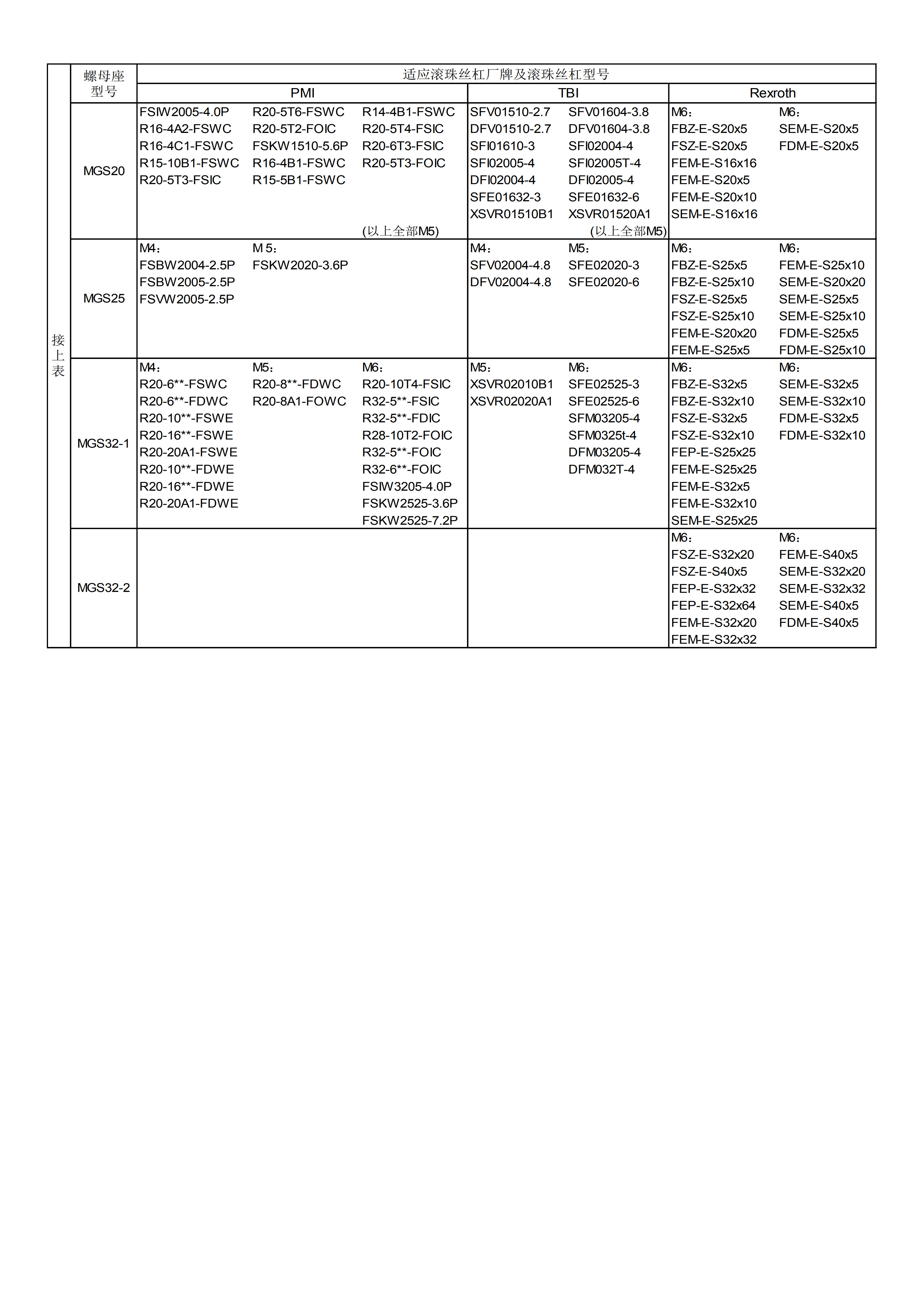公司研發(fā)和生產全型號世界著名廠商的滾珠絲杠專用螺母承座,特別是MGD/MGS系列,其安裝尺寸完全匹配標準化軋制滾珠絲杠螺母。各產品型號與臺灣嵩陽SYK,日本THK,日本NSK,MISUMI,德國Rexroth相應型號通用。NH系列為我公司國際首創(chuàng),在匯總了國際著名滾珠絲杠生產商螺母標準的基礎上,推出了各廠商間通用的螺母座安裝尺寸。MGS系列具體型號:MGS20、MGS25、MGS32-1、MGS32-2、MGS40-1、MGS40-2、MGS50。
