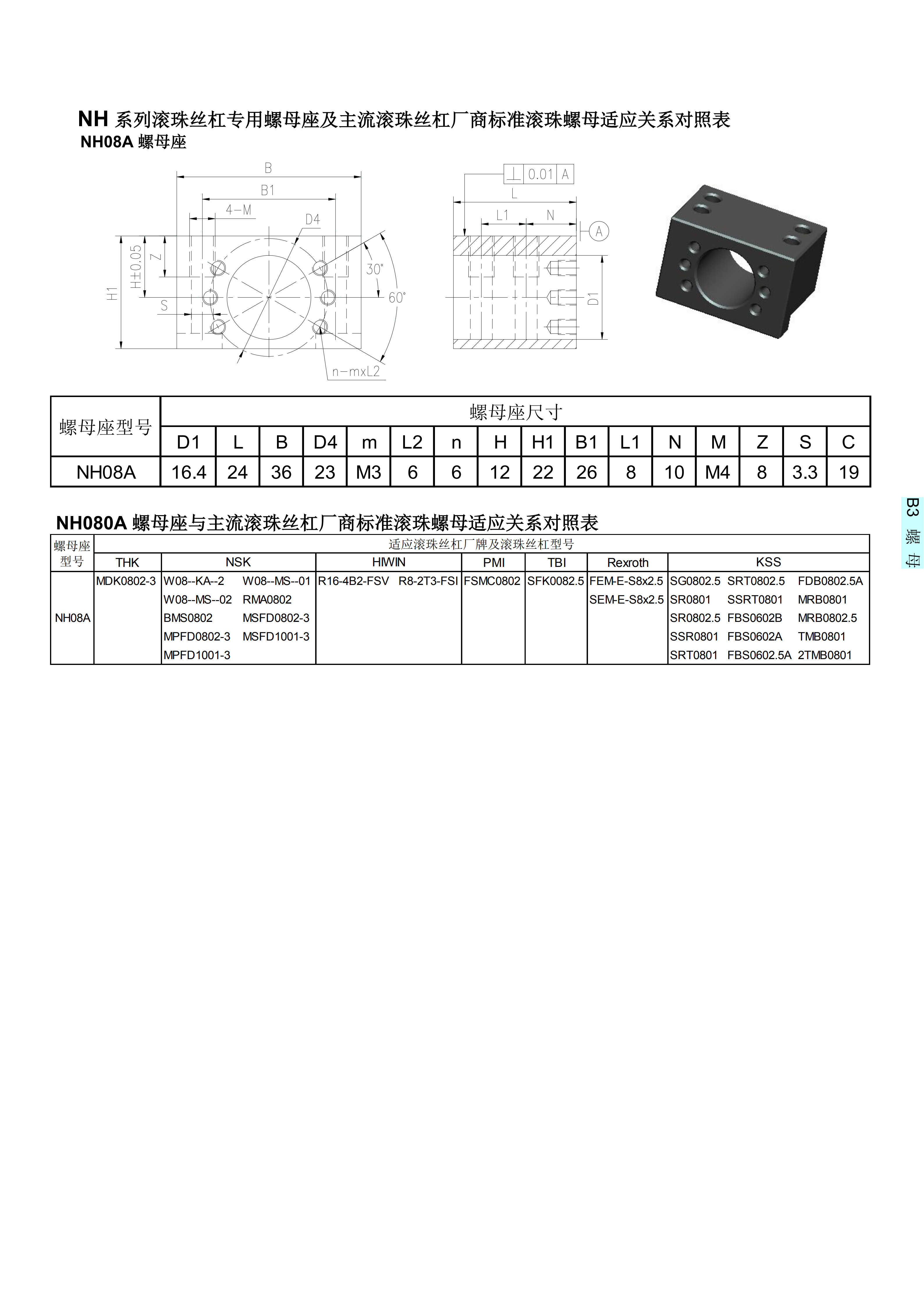 公司研發(fā)和生產(chǎn)全型號世界著名廠商的滾珠絲杠專用螺母承座,特別是MGD/MGS系列,其安裝尺寸完全匹配標(biāo)準(zhǔn)化軋制滾珠絲杠螺母。各產(chǎn)品型號與臺灣嵩陽SYK,日本THK,日本NSK,MISUMI,德國Rexroth相應(yīng)型號通用。NH系列為我公司國際首創(chuàng),在匯總了國際著名滾珠絲杠生產(chǎn)商螺母標(biāo)準(zhǔn)的基礎(chǔ)上,推出了各廠商間通用的螺母座安裝尺寸。MH08A系列具體型號:MH08A。