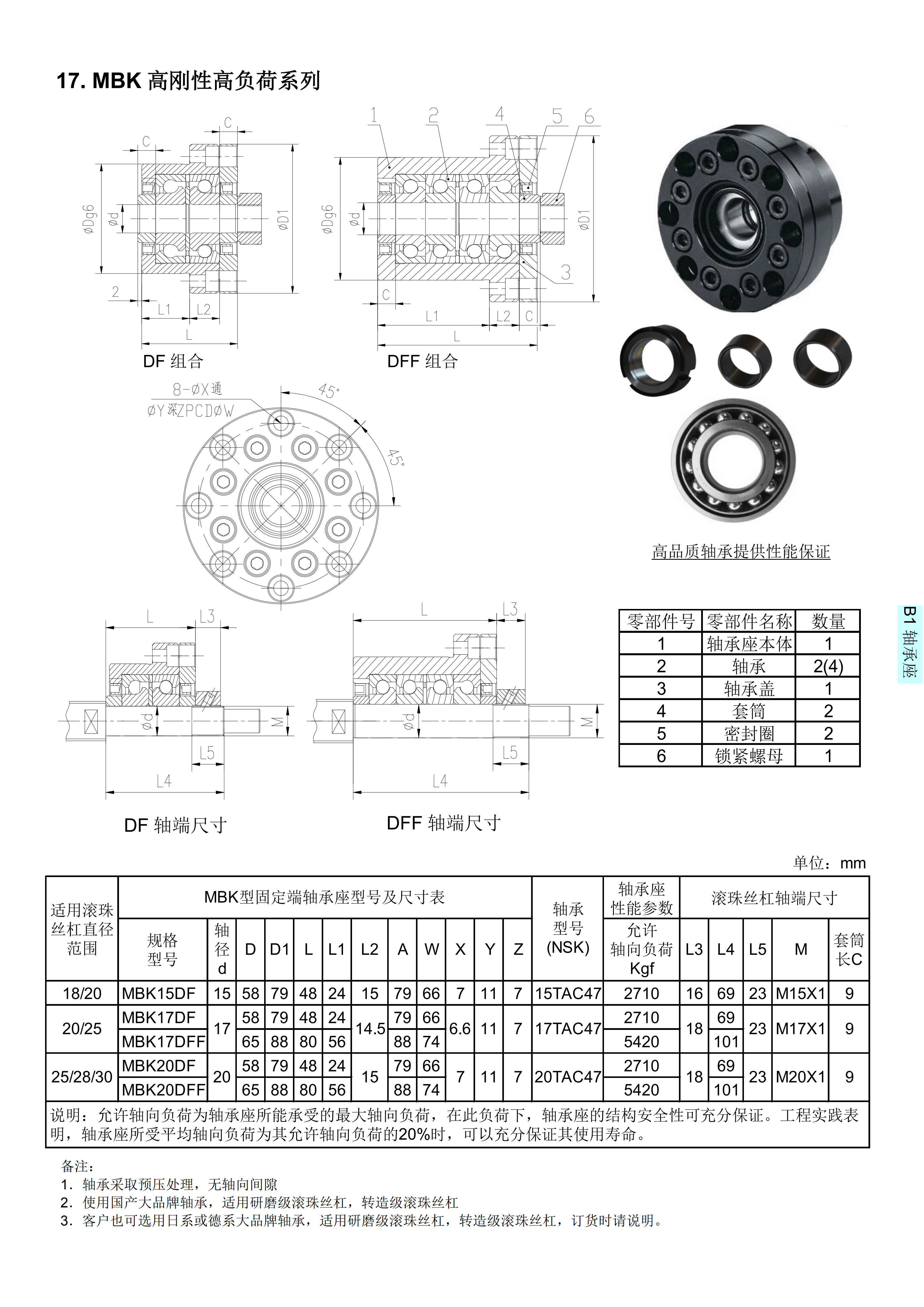 公司專(zhuān)業(yè)研發(fā)和生產(chǎn)世界著名廠商全型號(hào)滾珠絲杠專(zhuān)用精密軸承座,并在國(guó)際通用型號(hào)基礎(chǔ)上,首創(chuàng)了TAC系列重載精密滾珠絲杠專(zhuān)用軸承座。各產(chǎn)品型號(hào)與臺(tái)灣嵩陽(yáng)SYK,日本THK,日本NSK,MISUMI,德國(guó)Rexroth相應(yīng)型號(hào)通用。MBK系列具體型號(hào):MBK15DF-G、MBK17DF-G、MBK17DFF-G、MBK20DF-G、MBK20DFF-G。