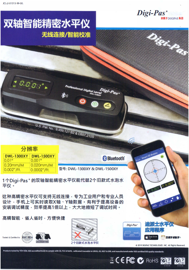 Digi-Pas 2軸智能精 密電子水平儀實(shí)現(xiàn)了數(shù)值數(shù)字化,并符合ISO / IEC 17025:2005和ANSI / NCSL Z540-1標(biāo)準(zhǔn)(可追溯到NIST,JIS和DIN),美國,日本,德國由第三方認(rèn)可的校準(zhǔn)實(shí)驗(yàn)室和測(cè)試實(shí)驗(yàn)室驗(yàn)證