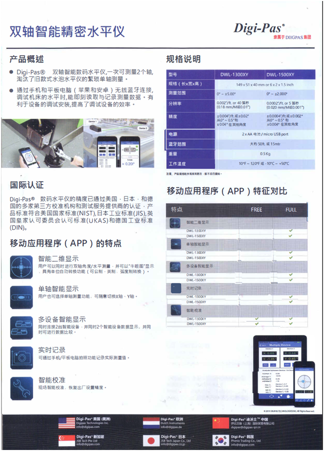 Digi-Pas DWL-1500XY是一款經(jīng)濟(jì)實(shí)惠的,具有無線藍(lán)牙功能的2軸智能精 密電子水平儀,專為工業(yè)用戶和工程技術(shù)人員設(shè)計(jì)(0.001°分辨率)。