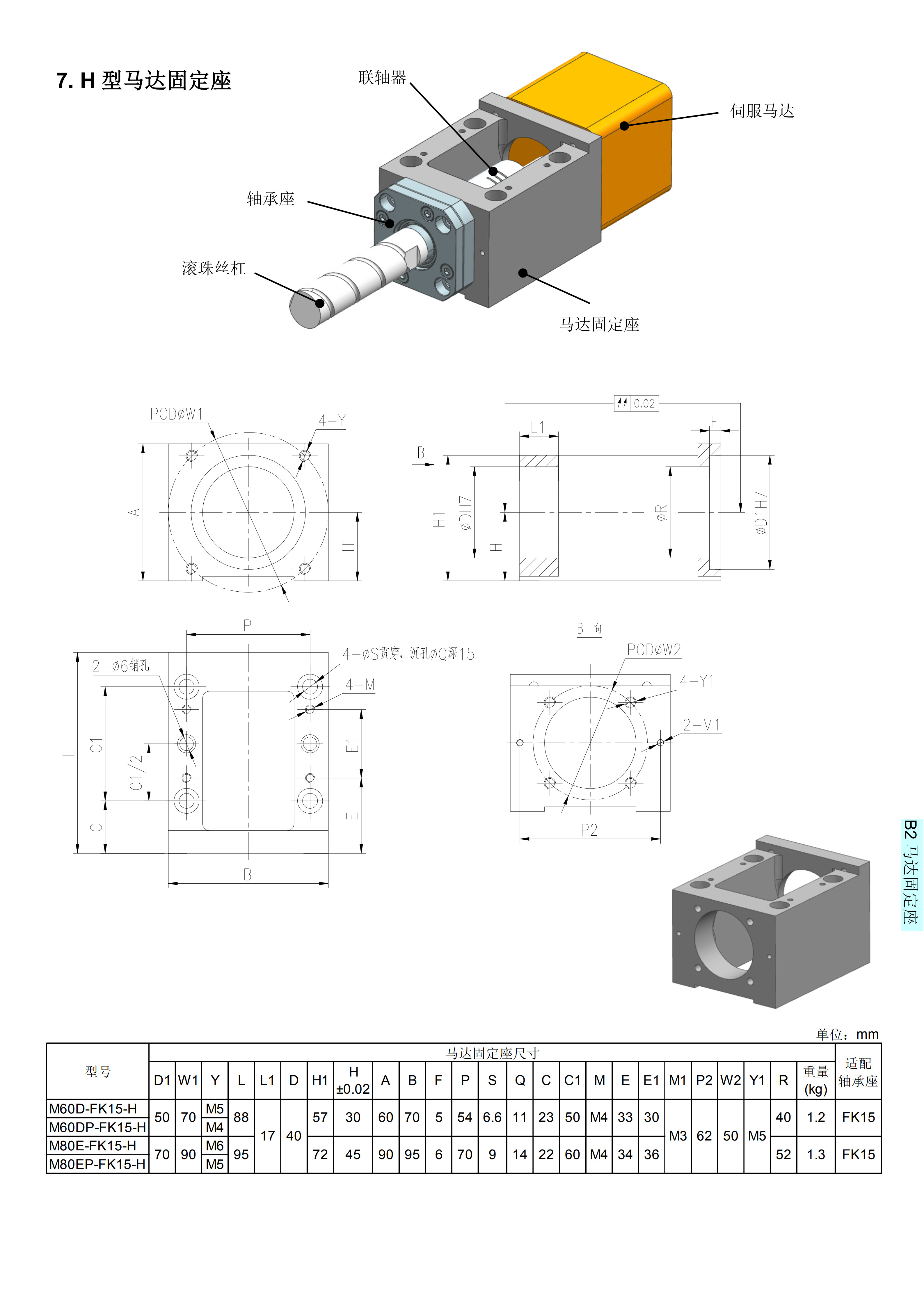 公司研發(fā)和生產(chǎn)的馬達固定座,馬達端可適應(yīng)松下,三菱,臺達,東方等著名廠商的伺服馬達/步進馬達,軸承座一端適用國際標(biāo)準(zhǔn)化軸承座,從而,馬達安裝與滾珠絲杠可保證同心,提高安裝效率與安裝質(zhì)量。A型,B型,C型,H型,L型與臺灣嵩陽SYK相應(yīng)型號通用;KK型等同臺灣上銀KK系列,PMI之KM系列,日本THK之KR/SKR等線性模的固定端。H型馬達座具體型號:M60D-FK15-H、M60DP-FK15-H、M80E-FK15-H、M80EP-FK15-H。