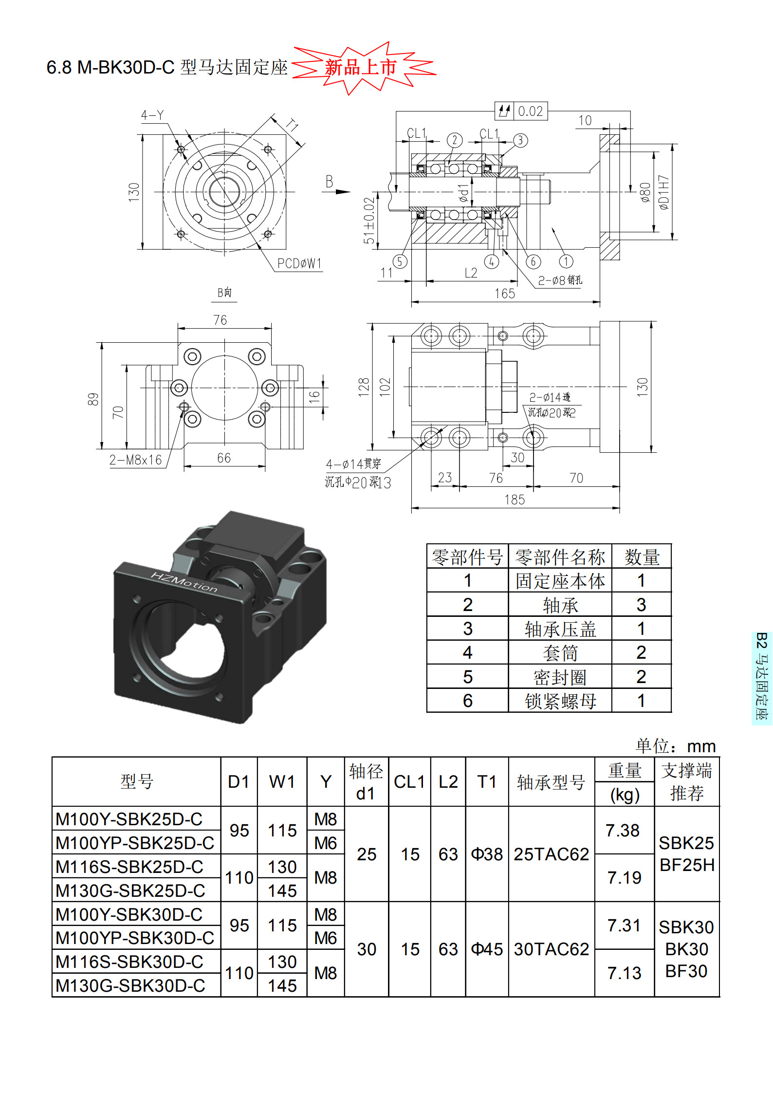 公司研發(fā)和生產(chǎn)的馬達(dá)固定座,馬達(dá)端可適應(yīng)松下,三菱,臺(tái)達(dá),東方等著名廠商的伺服馬達(dá)/步進(jìn)馬達(dá),軸承座一端適用國(guó)際標(biāo)準(zhǔn)化軸承座,從而,馬達(dá)安裝與滾珠絲杠可保證同心,提高安裝效率與安裝質(zhì)量。A型,B型,C型,H型,L型與臺(tái)灣嵩陽(yáng)SYK相應(yīng)型號(hào)通用;KK型等同臺(tái)灣上銀KK系列,PMI之KM系列,日本THK之KR/SKR等線性模的固定端。M-BK30D-C型馬達(dá)座具體型號(hào):M100Y-SBK25D-C、M100YP-SBK25D-C、M116S-SBK25D-C、M130G-SBK25D-C、M100Y-SBK30D-C、M100YP-SBK30D-C、M116S-SBK30D-C、M130G-SBK30D-C。
