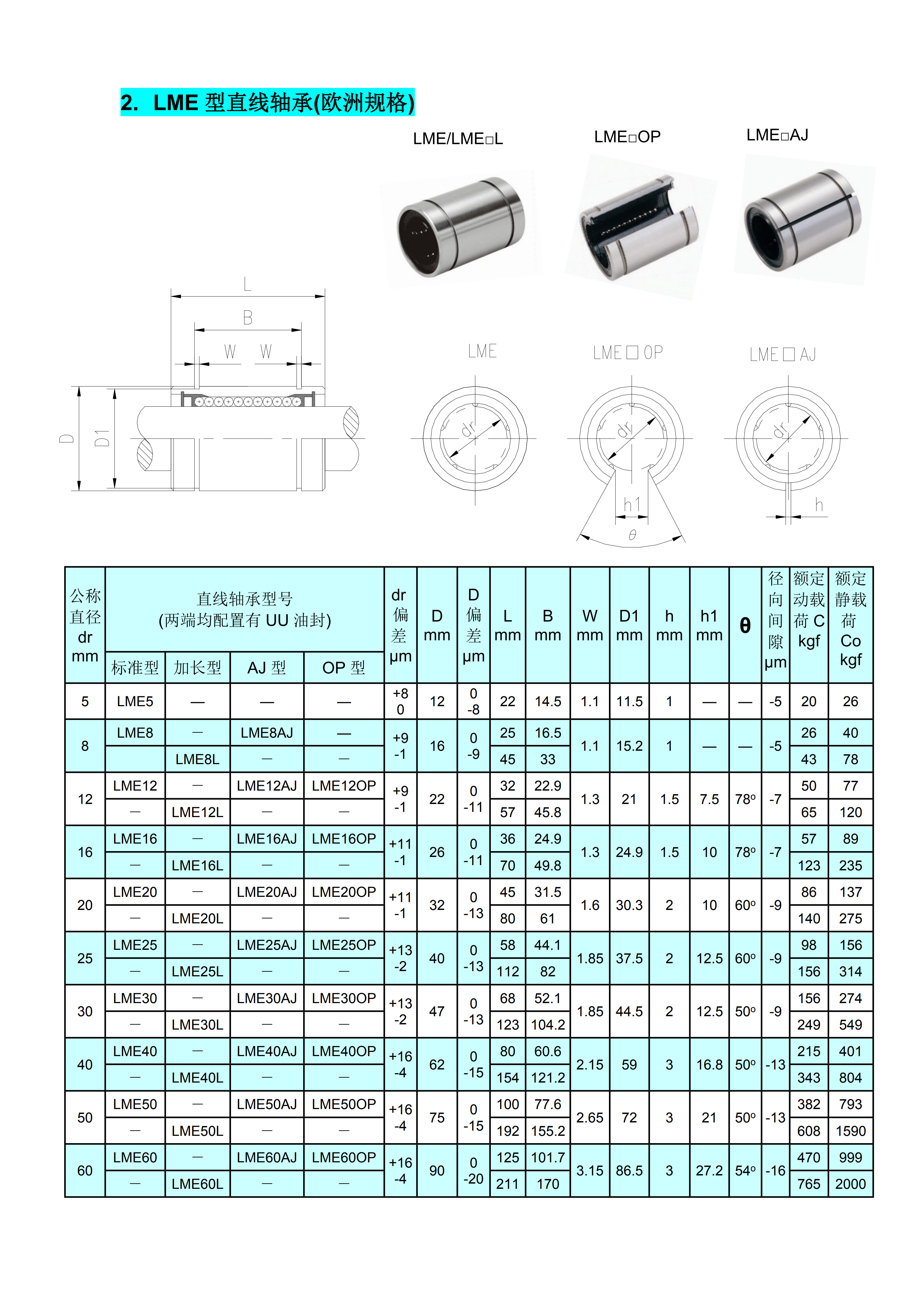 直線軸承是一種經(jīng)濟(jì)型的直線導(dǎo)向部件,公稱直徑5mm到60mm。直線軸承LM為圓形,LMF為法蘭型,按安裝尺寸分日規(guī)與歐規(guī),歐規(guī)型號(hào)后加E。直線光軸材質(zhì)為軸承鋼,淬火后磨削加工,然后鍍硬鉻,型號(hào)SCF。為方便客戶使用,還使用直線軸承搭建了SBR/TBR直線導(dǎo)軌,SC箱式直線軸承單元。同時(shí),配有軸支座SK,SHF方便客戶選用。